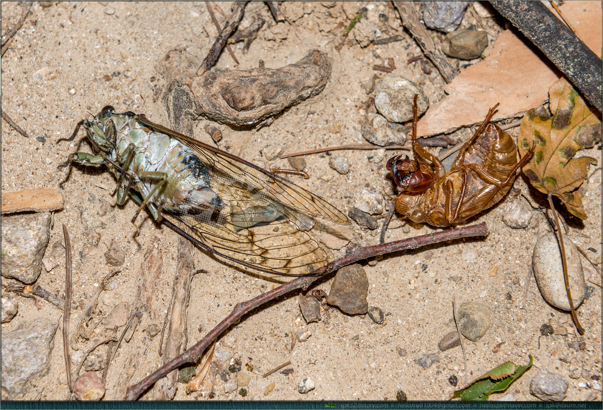 힘겹게 우화에 성공한 듯 보이는 매미와 그 흔적들이 고스란히 땅에 내팽겨쳐져 있다.